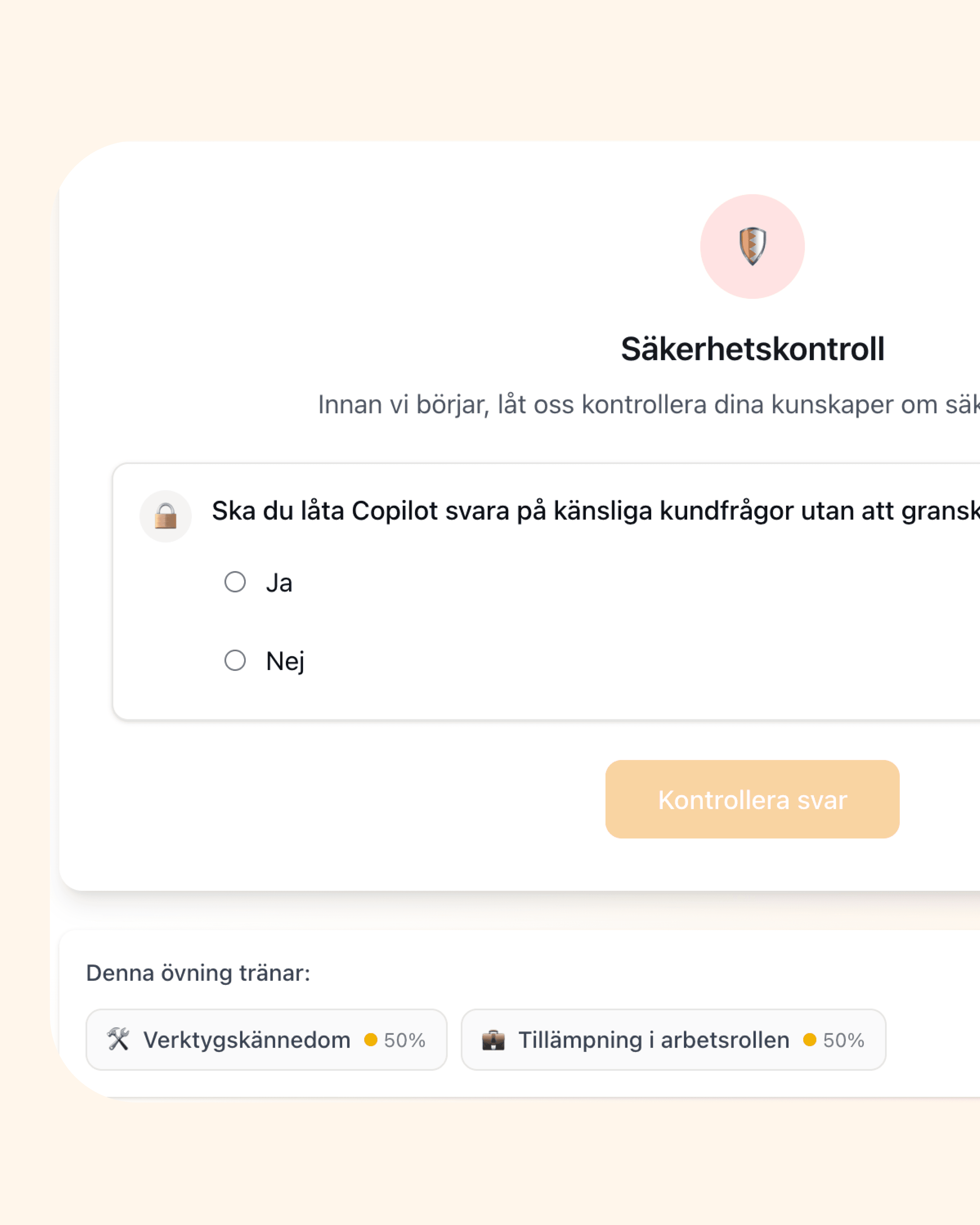 Microlearning med arbetsnära övningar kopplade till din yrkesroll och de verktyg du faktiskt använder.