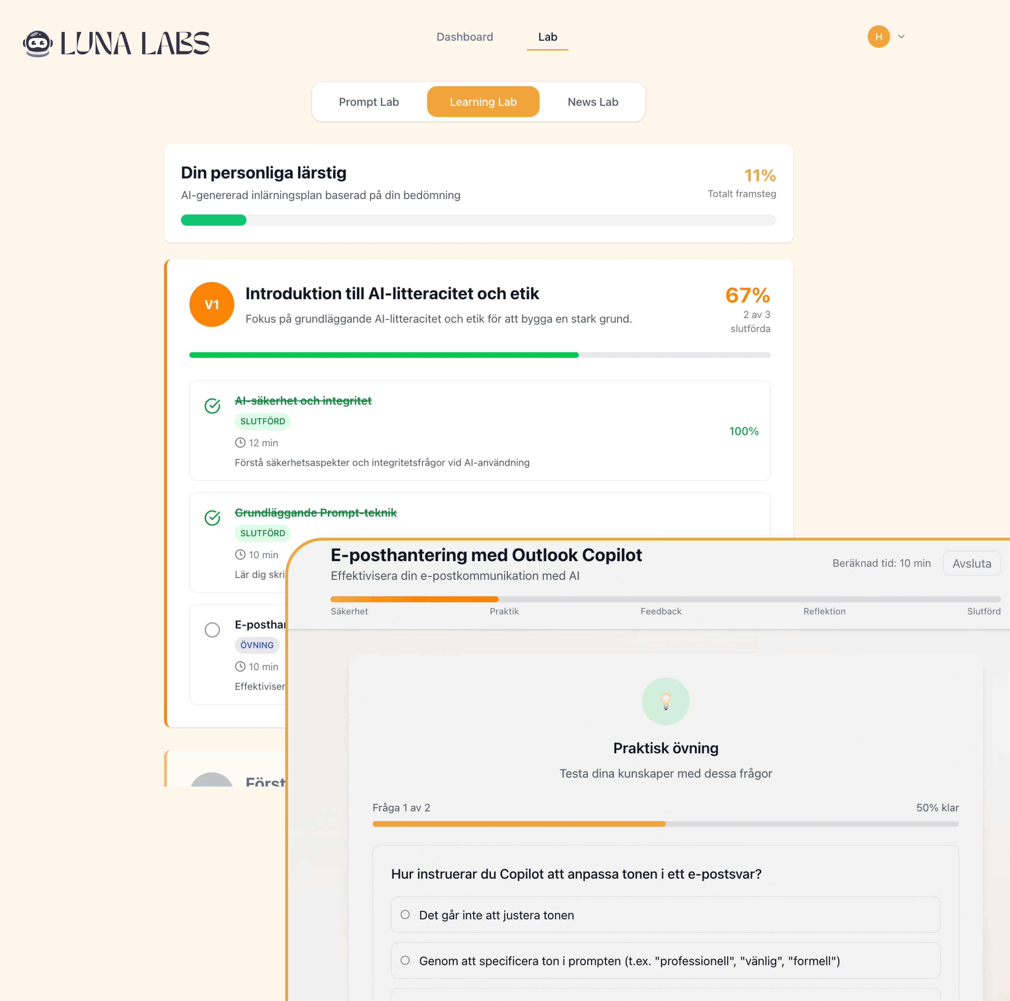 Vi kombinerar pedagogik och teknik för att göra AI-lärande praktiskt, mätbart och anpassat till varje roll.