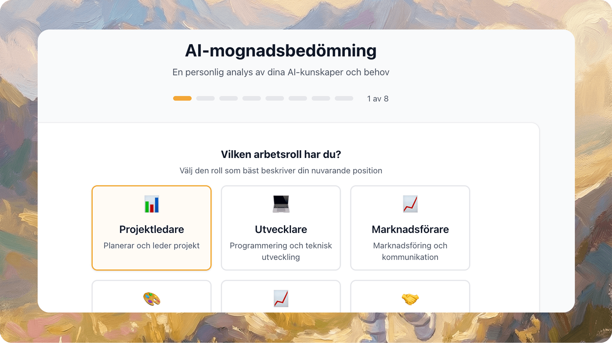 Kartlägg din roll, dina AI-verktyg och din nuvarande AI-mognad för att få en individanpassad start.