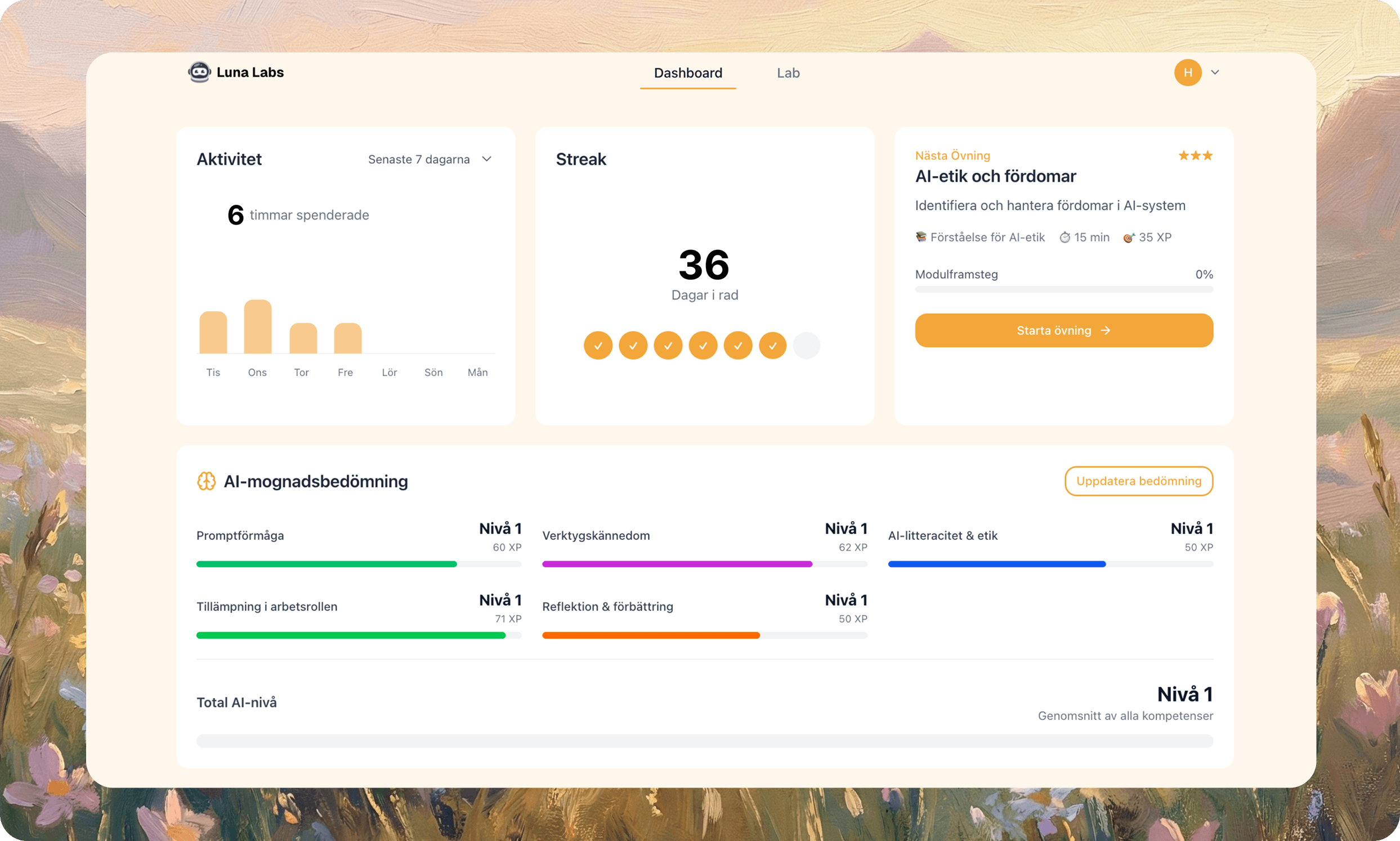 Luna Labs är en individanpassad AI-lärplattform för organisationer. Utbildningen utgår från varje deltagares nuläge och roll, och kombinerar korta mikrolektioner, praktiska övningar och relevanta AI-nyheter. Målet är att göra AI konkret, användbart och lätt att tillämpa i det dagliga arbetet.